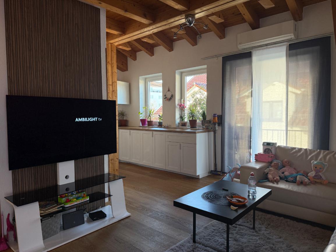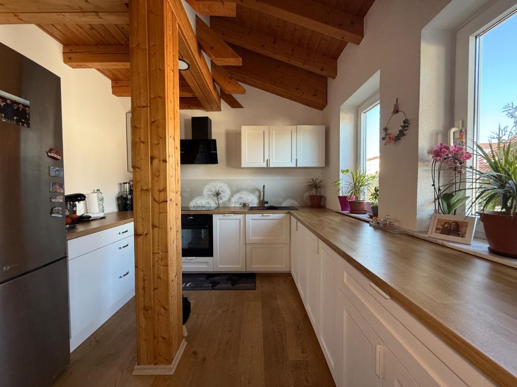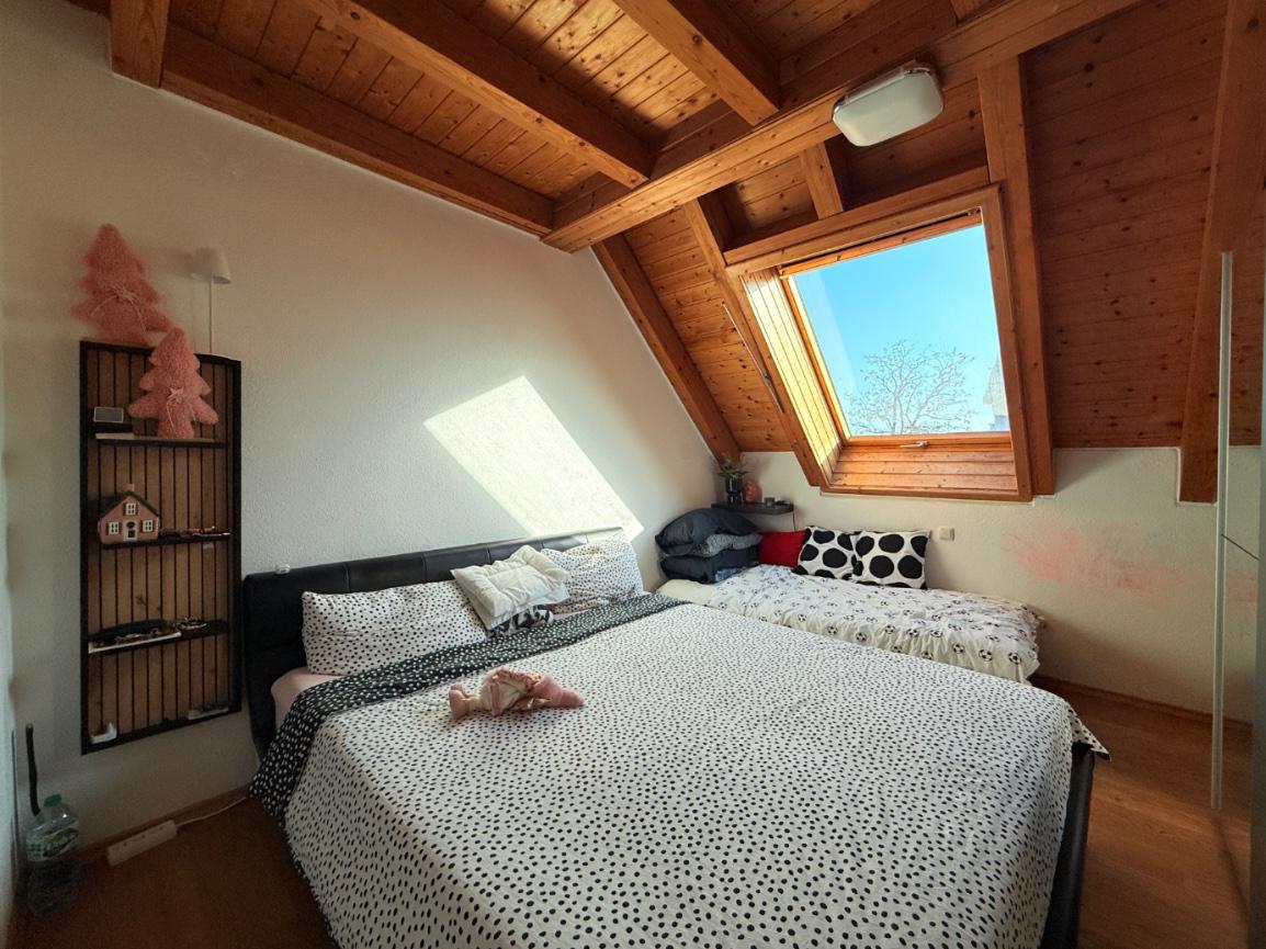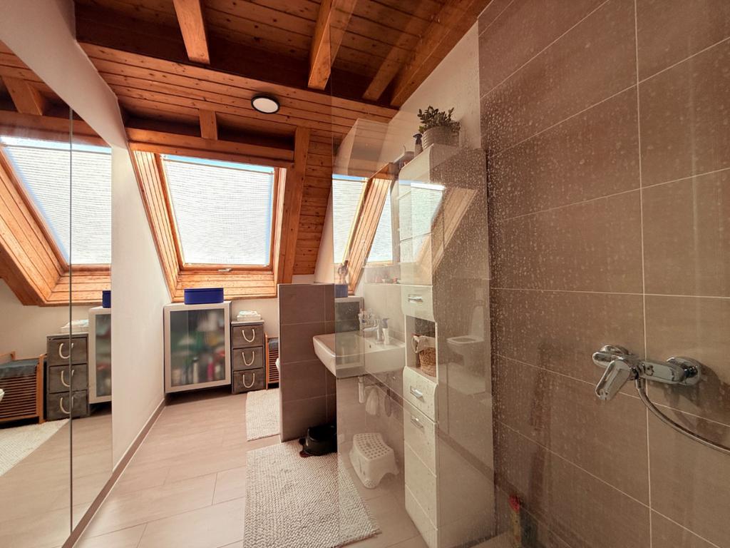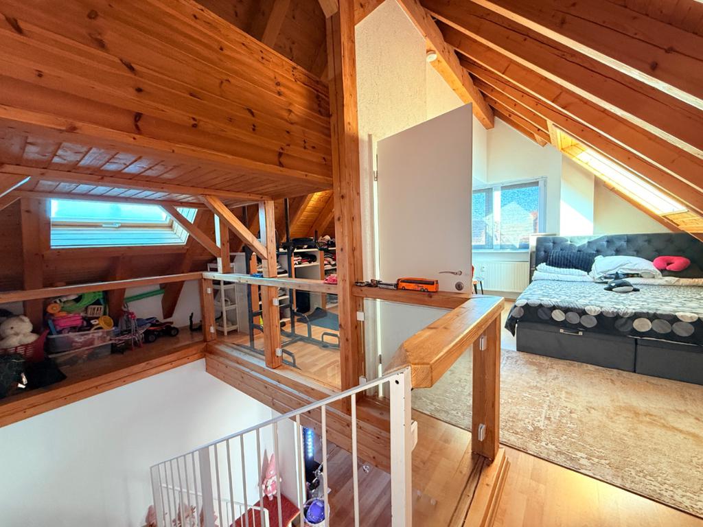 Dieses Moderne und gut geschnittene Wohnobjekt erstreckt sich über ein großzügiges Obergeschoss sowie ein voll ausgebautes Dachgeschoss und bietet damit viel Platz für individuelles Wohnen. Die beiden Ebenen sind optimal aufgeteilt und schaffen eine angenehme Wohnatmosphäre mit lichtdurchfluteten Räumen und einem durchdachten Grundriss. Das Obergeschoss verfügt über ein helles Wohnzimmer, eine funktionale Küche, ein geräumiges Schlafzimmer sowie ein modernes Badezimmer. Die großen Fenster ermöglichen einen weiten Blick ins Grüne und sorgen den ganzen Tag über für viel Tageslicht. Über eine interne Treppe gelangt man in das Dachgeschoss, das als zusätzlicher Wohn- oder Arbeitsbereich genutzt werden kann. Die offene Gestaltung und die Dachschrägen verleihen diesem Bereich einen besonderen Charme. Ideal als Home-Office, Gästezimmer oder Jugendzimmer. Die Immobilie verbindet Komfort, Funktionalität und Wohnqualität und eignet sich perfekt für Paare, Famil